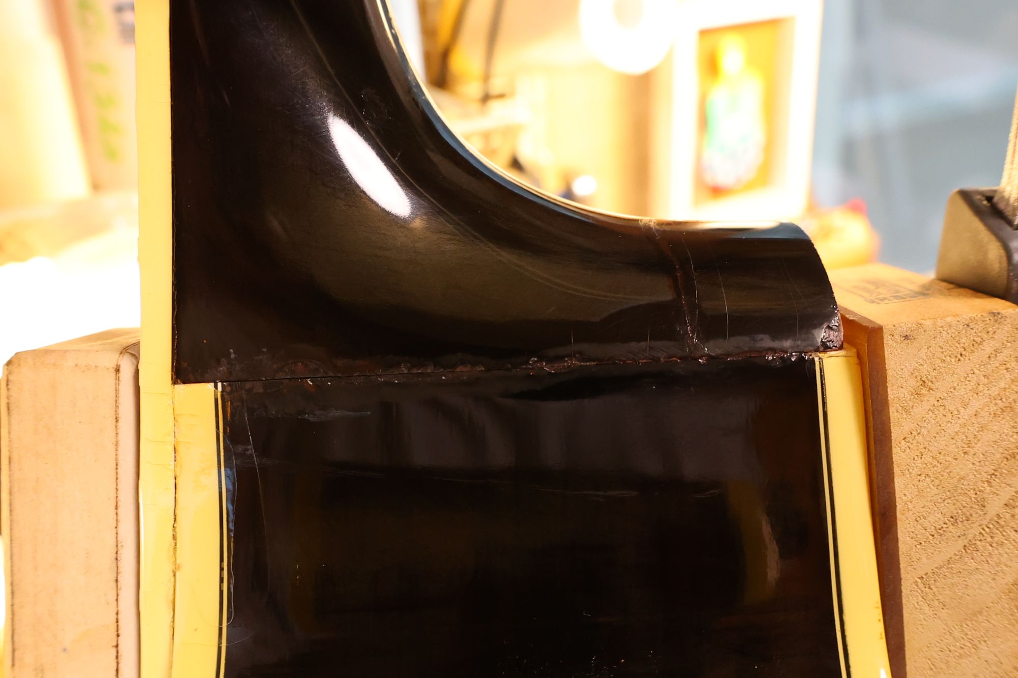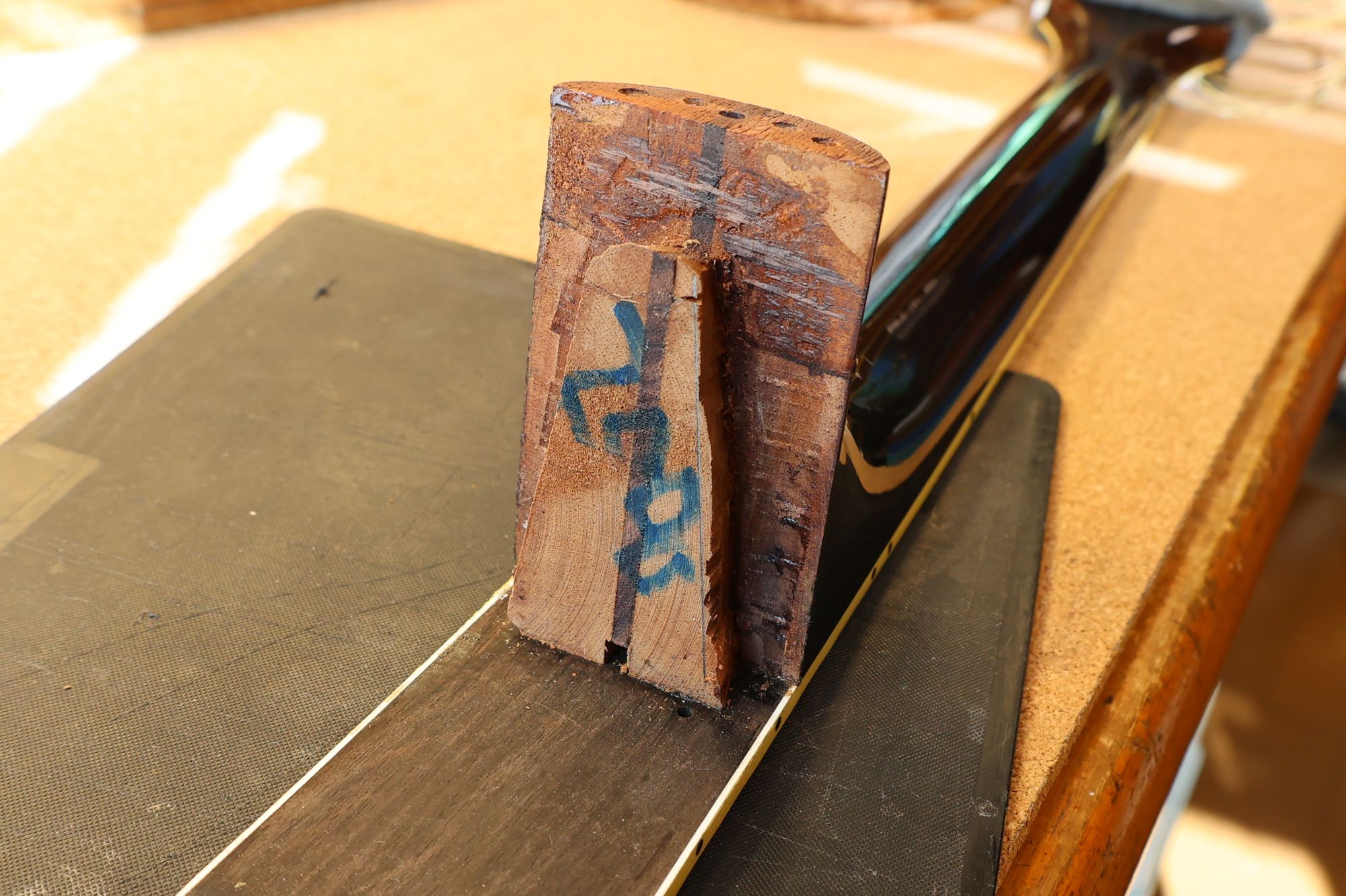 - 14.ヒール部修復を行いましょう。まず分離したネックの接着を行います。