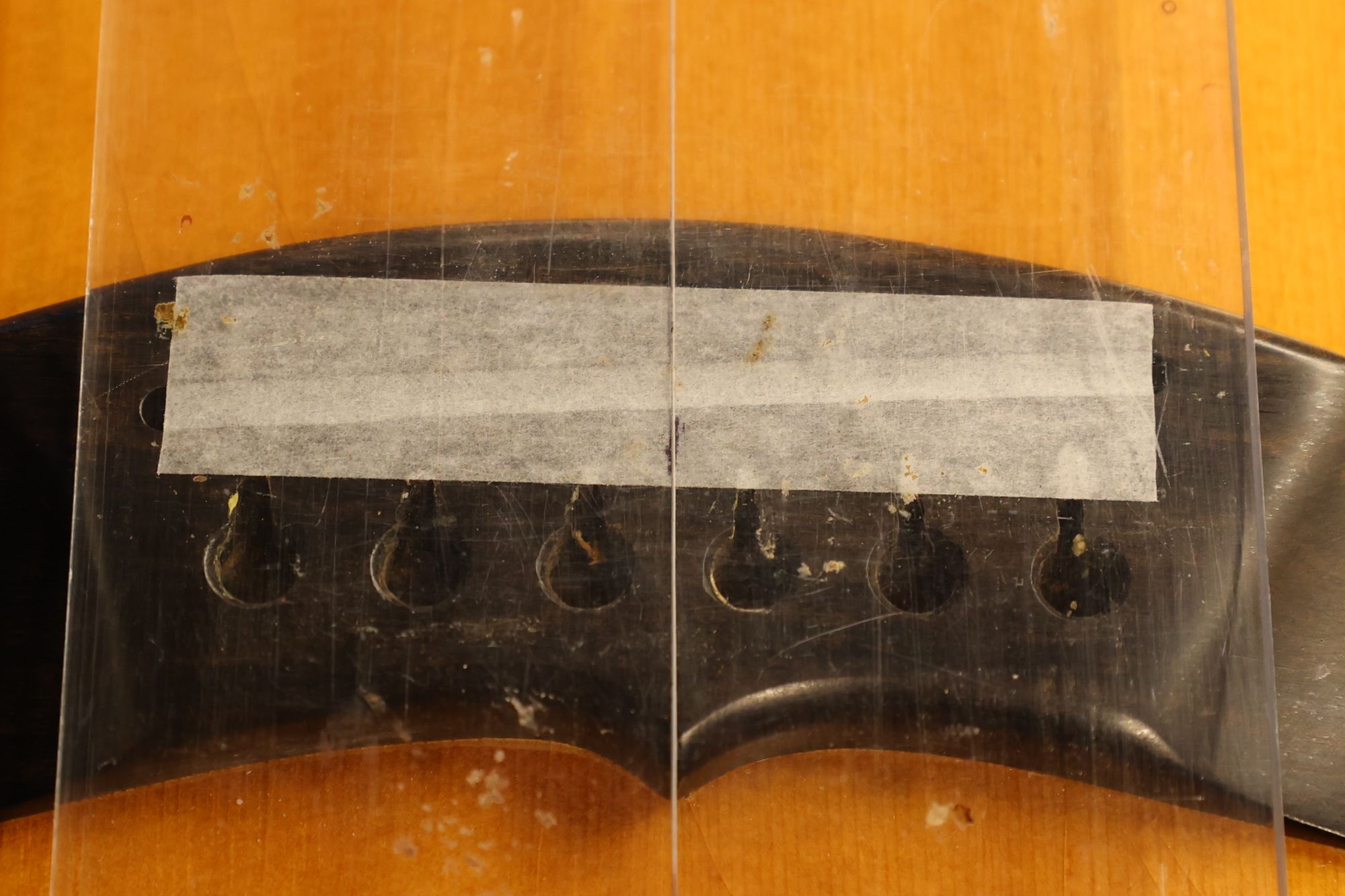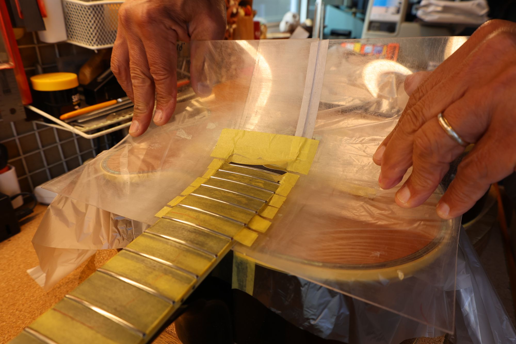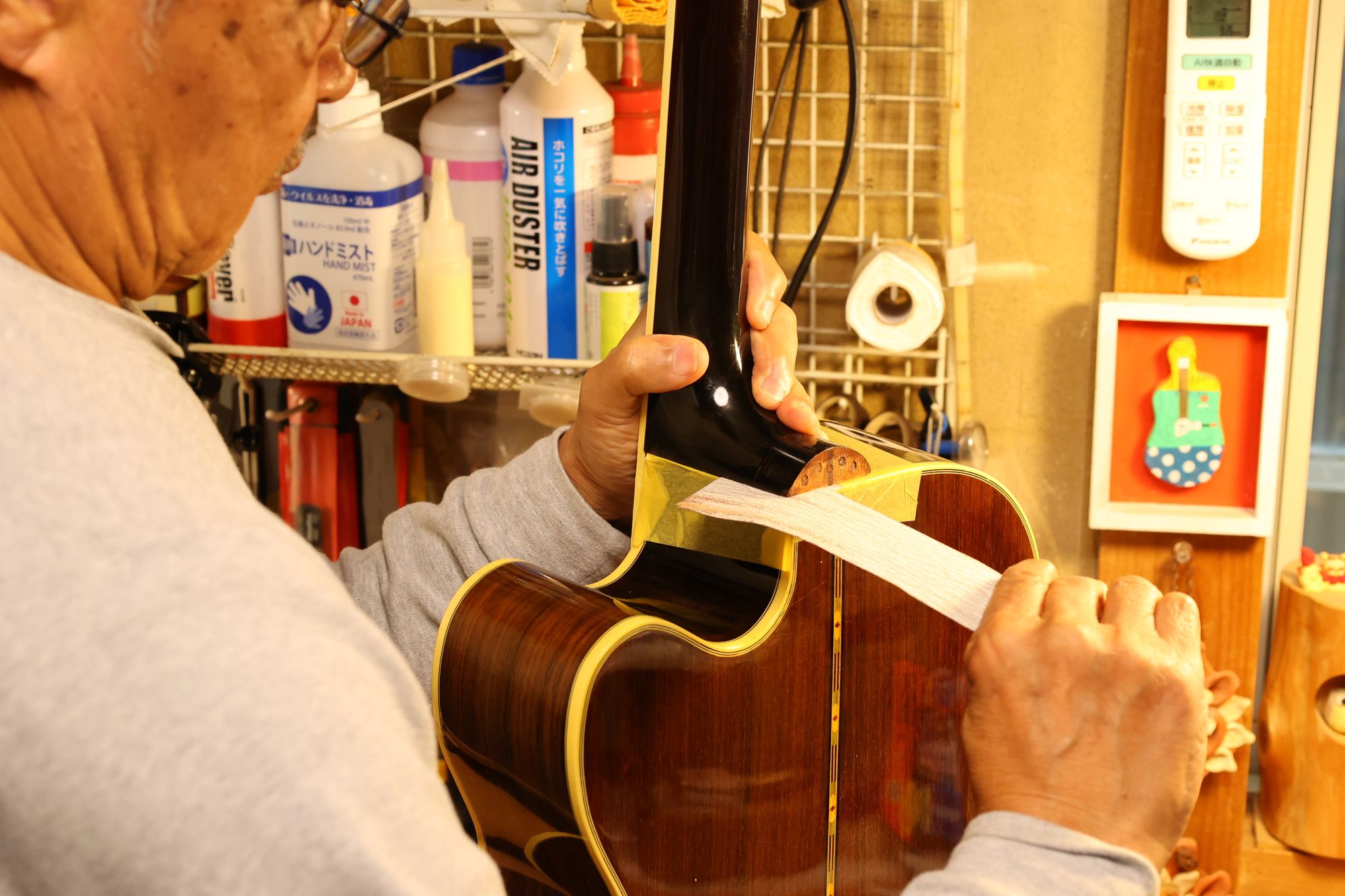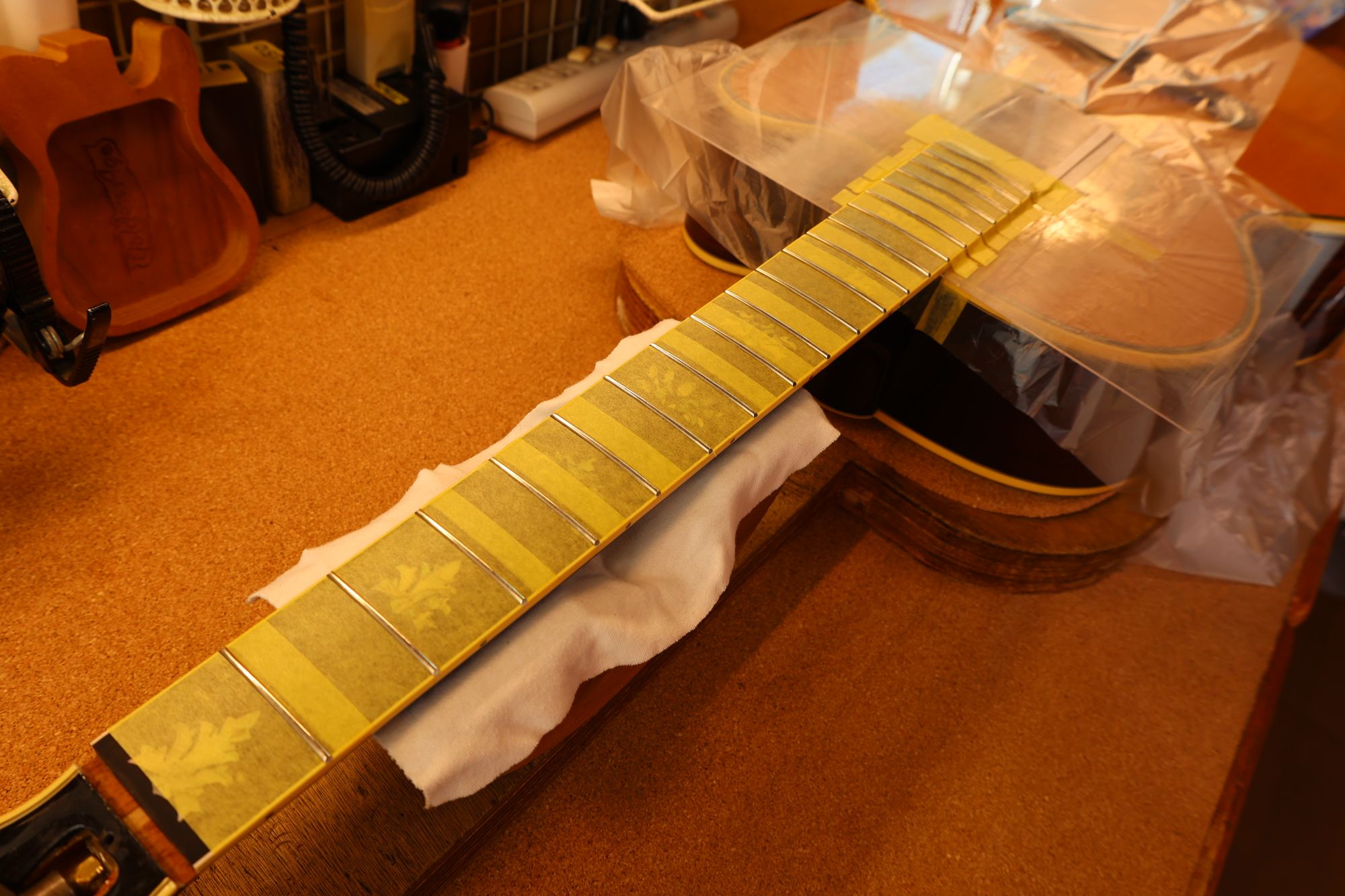 - 35.引き続いてフレットすりあわせを行いましょう。マスキングテープでフィンガーボードを保護します。