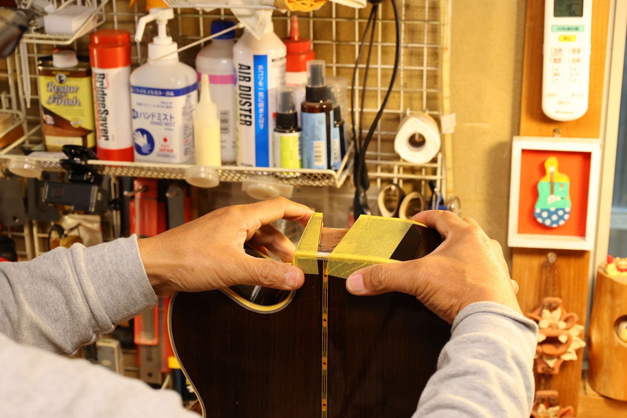 - 36.ボディ側ネックスロットの外側にマスキングテープを貼ってボディを保護します。