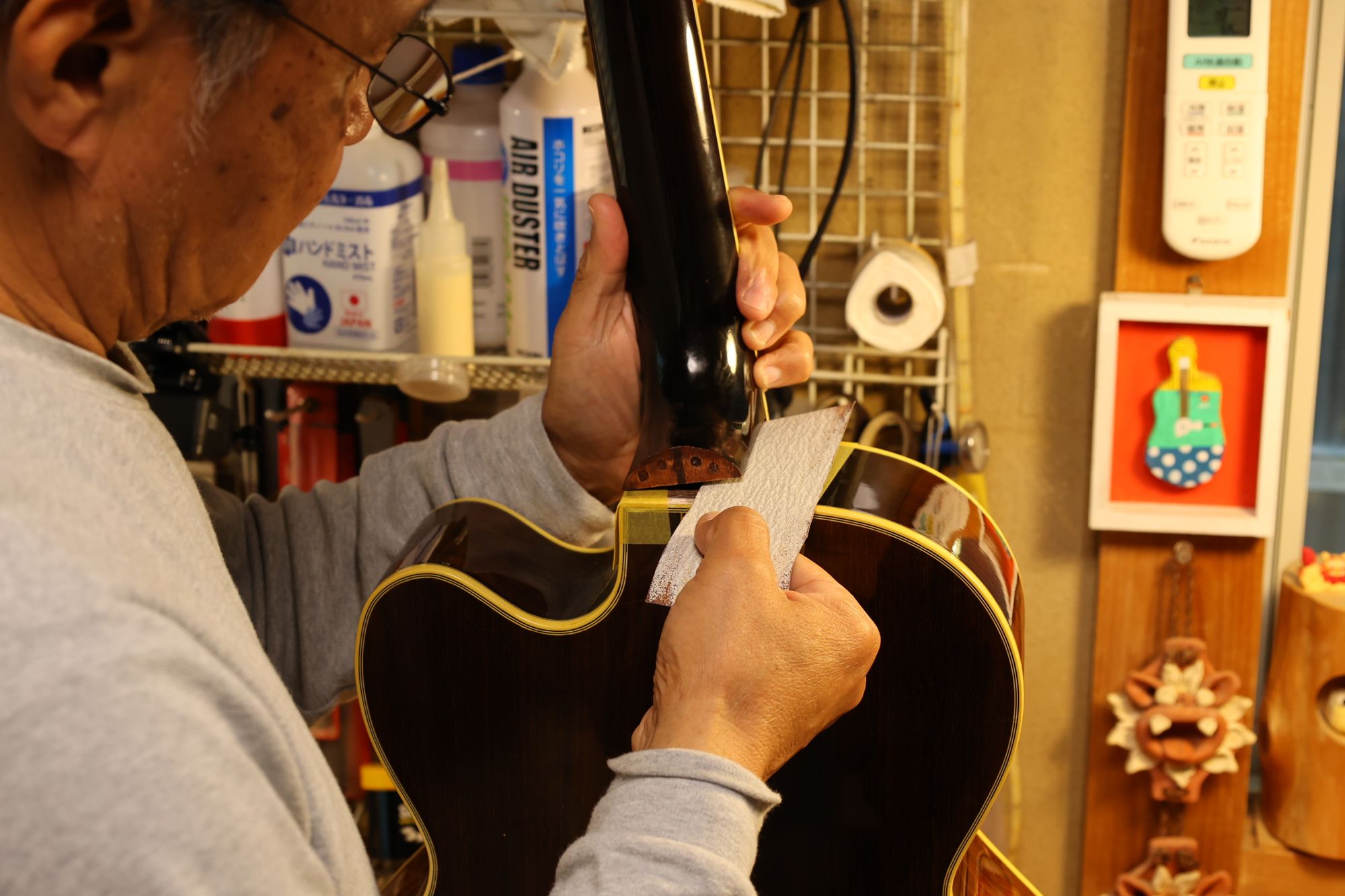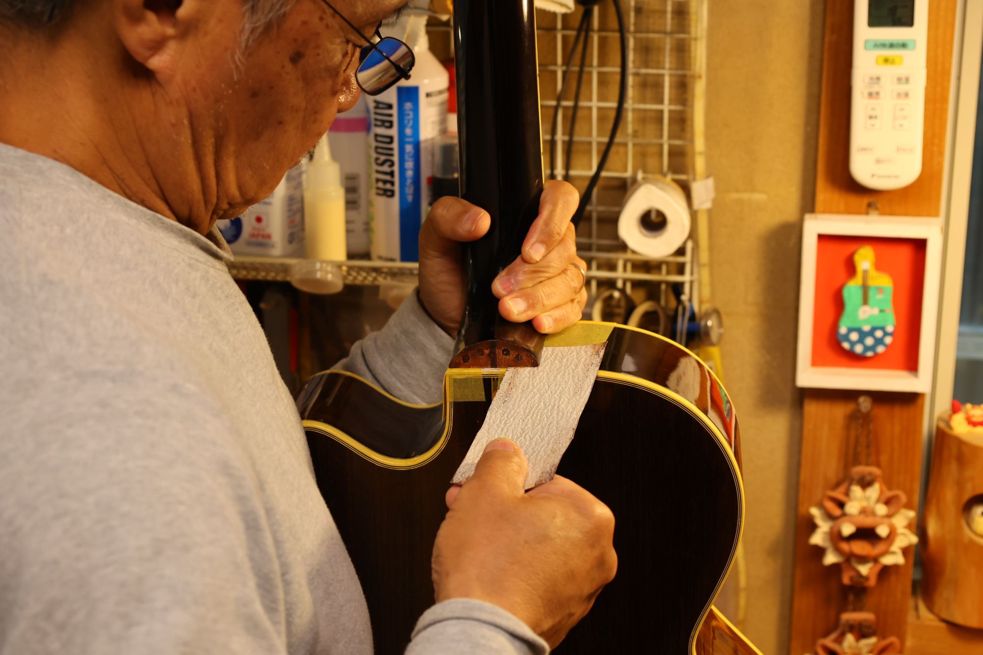 - 37.ネックとボディの間にサンドペーパーを挟みます。