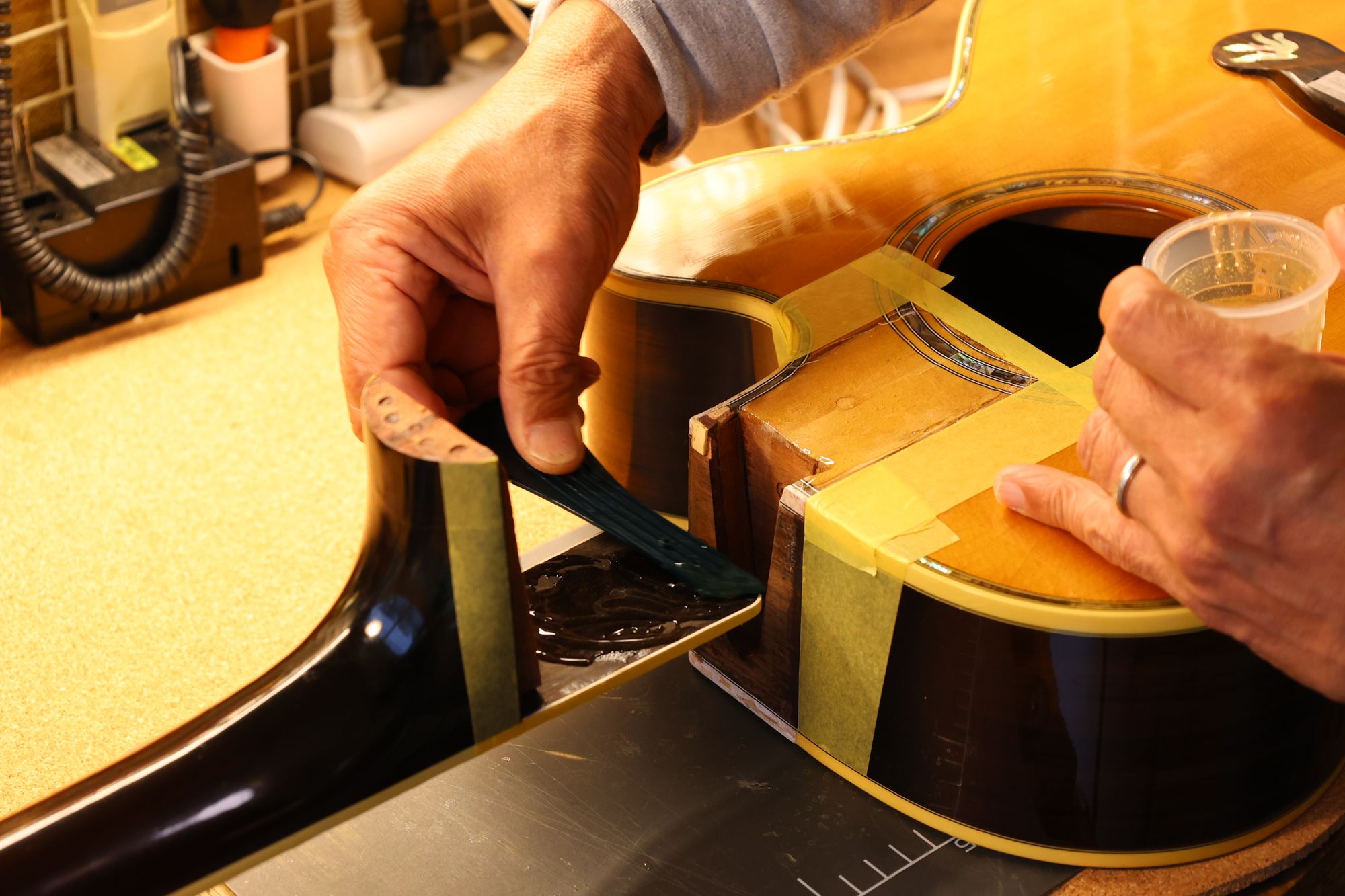 - 47.HideGlue(膠:ニカワ)をフィンガーボード裏とネック接合部に塗っていきます。
