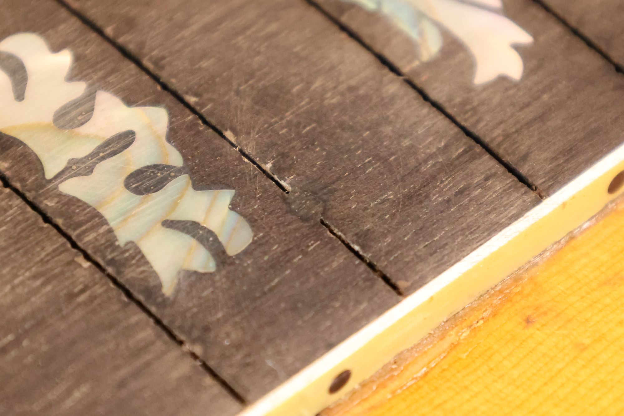 - 2.フレット溝を傷つけないようにハンダゴテで暖めながらゆっくりと抜いていきます。
