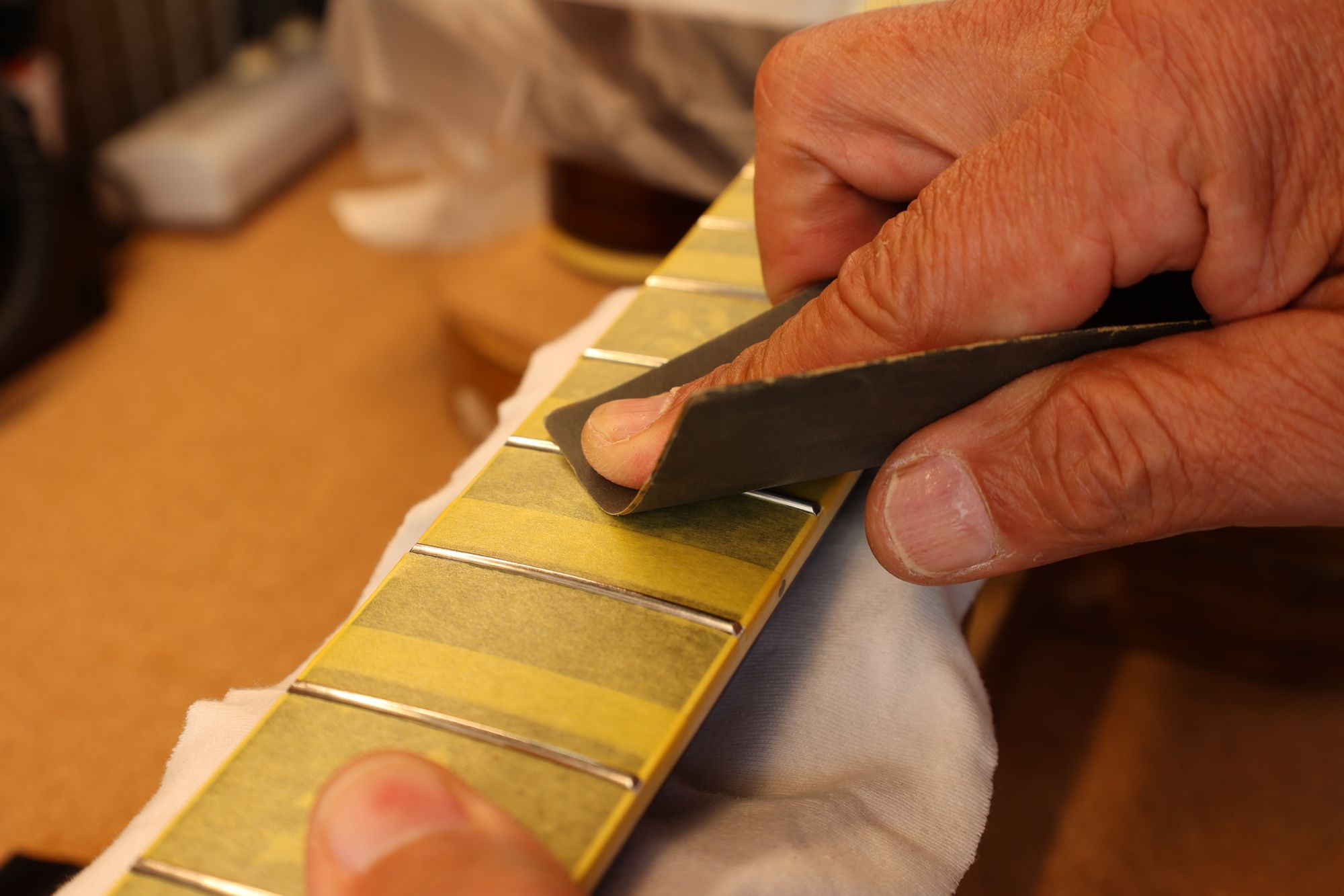 - 39.平らになったフレット山を専用のヤスリで丸くしていきます。