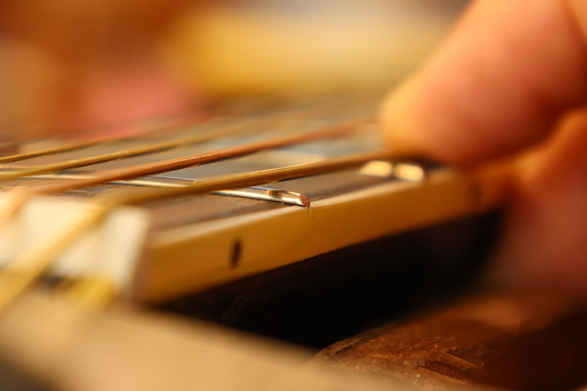 - 21.弦を張って弦高調整を行います。2フレットを指で押さえて1フレットと弦の隙間がギリギリに下がるまでナット高を下げます。