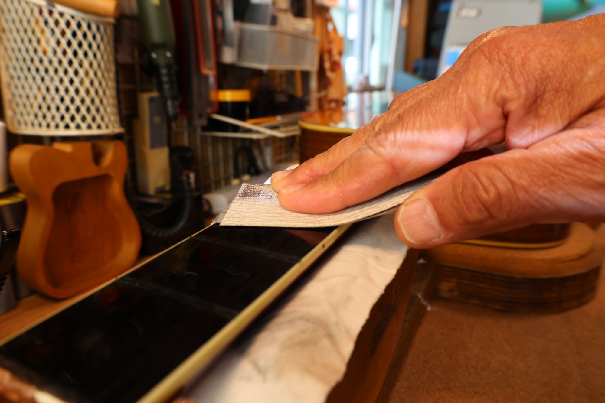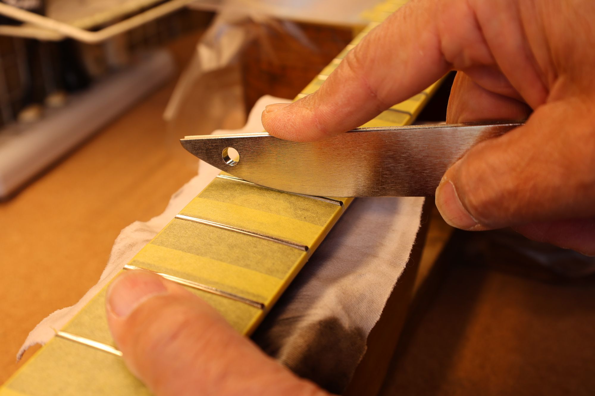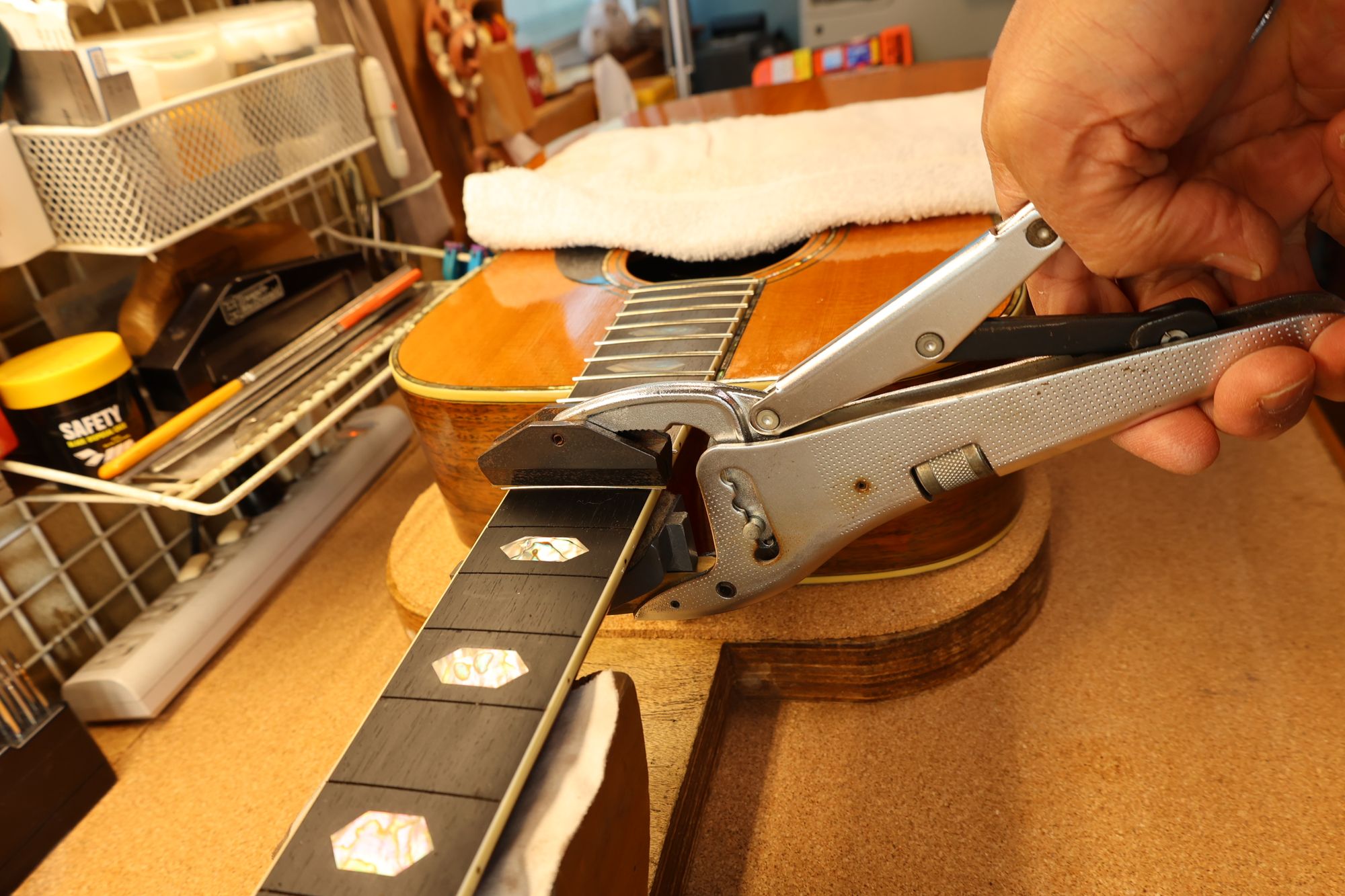 - 27.専用のヤスリを使ってフレット端を整形します。