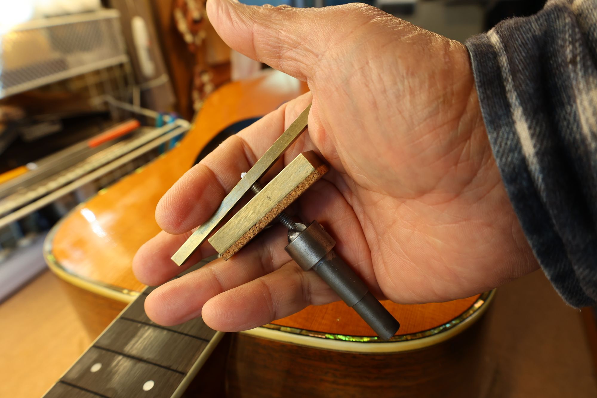 リペア前の試奏では弦高が高くて弾きにくいのと、こもりがちの音色でギターがとても寂しそうに見えました。