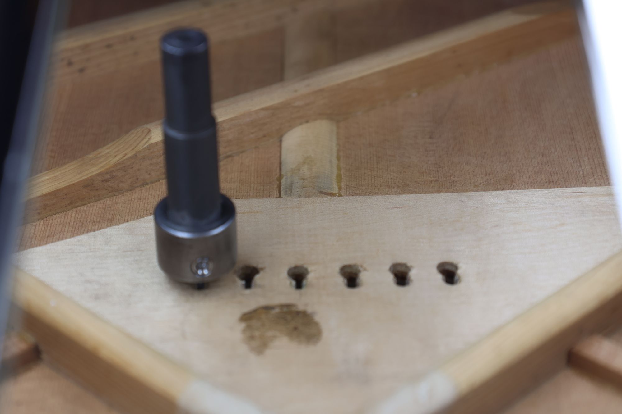 - 5.小穴があいたプラグです。まだ材に固定されています。