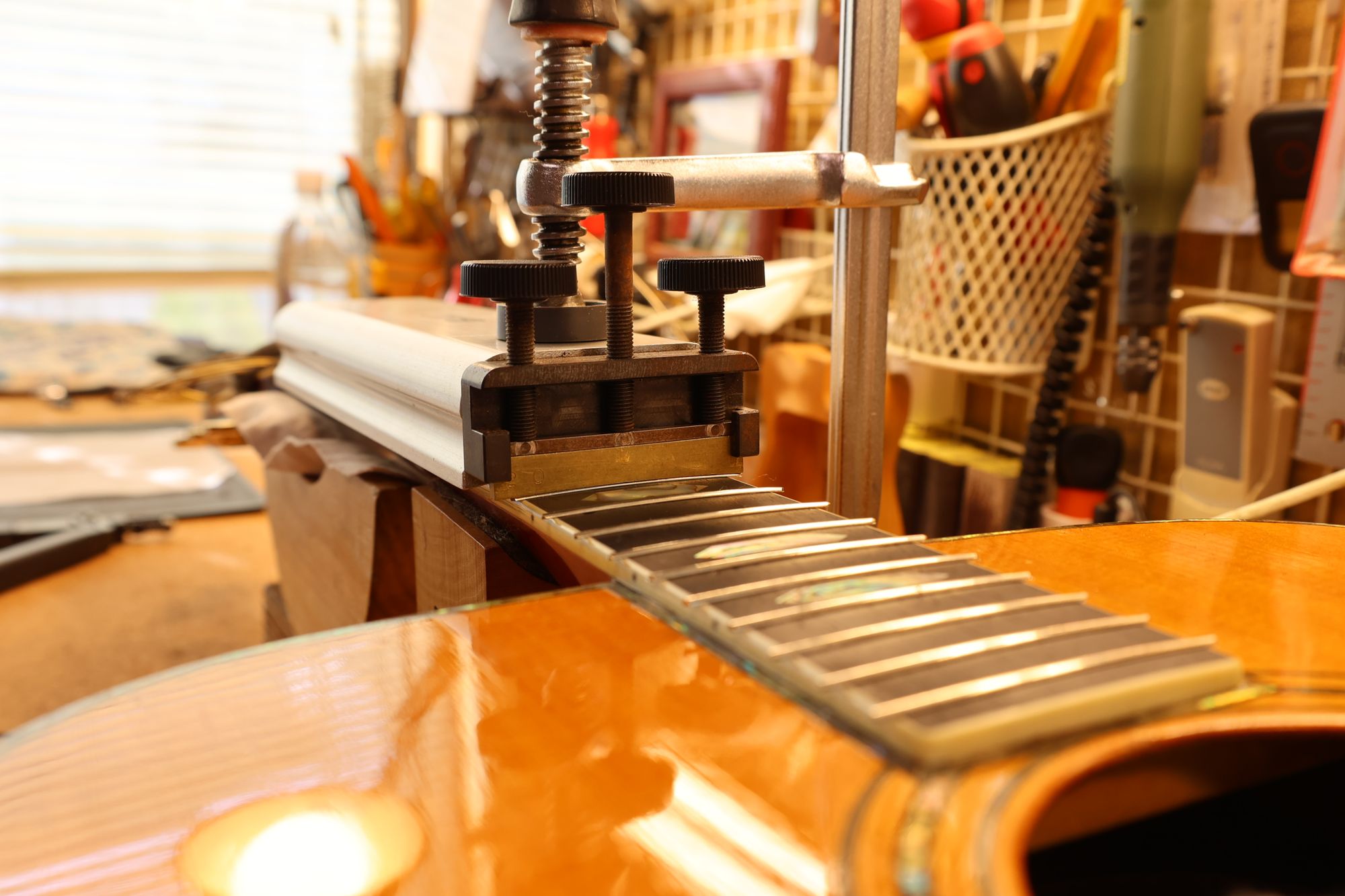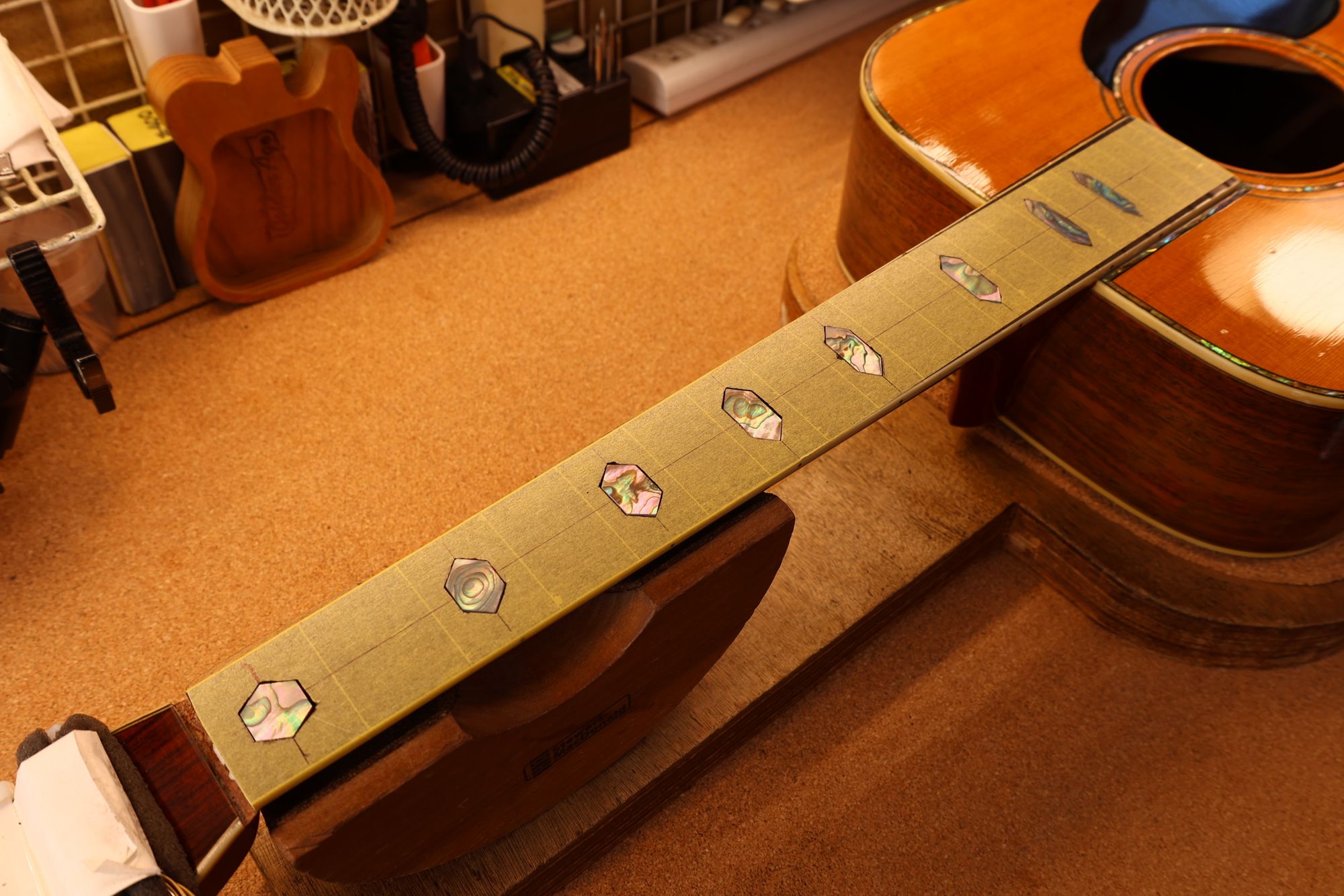 - 7.ポジションマークインレイを入れ替えてフレットプレスの準備が整いました。