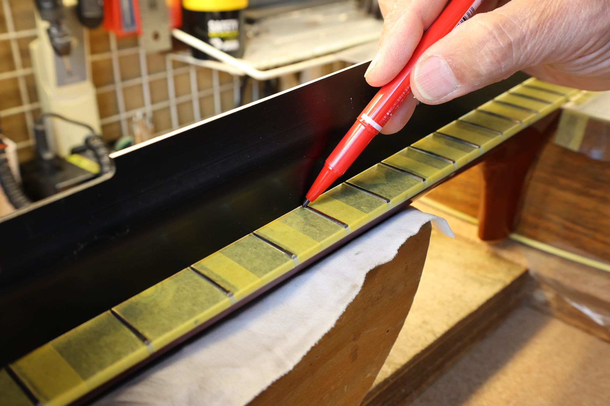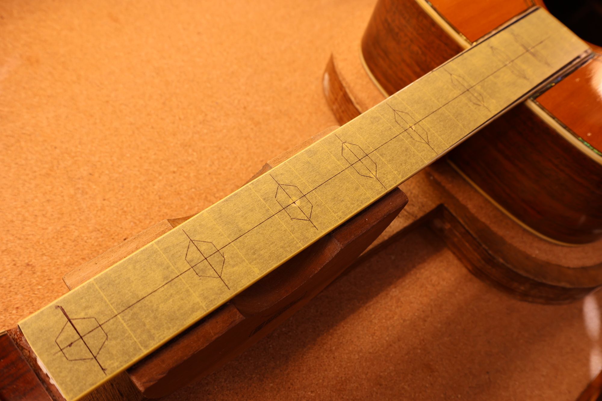 - 8.フィンガーボードをマスキングテープで保護し、インレイ加工位置を書き込みました。