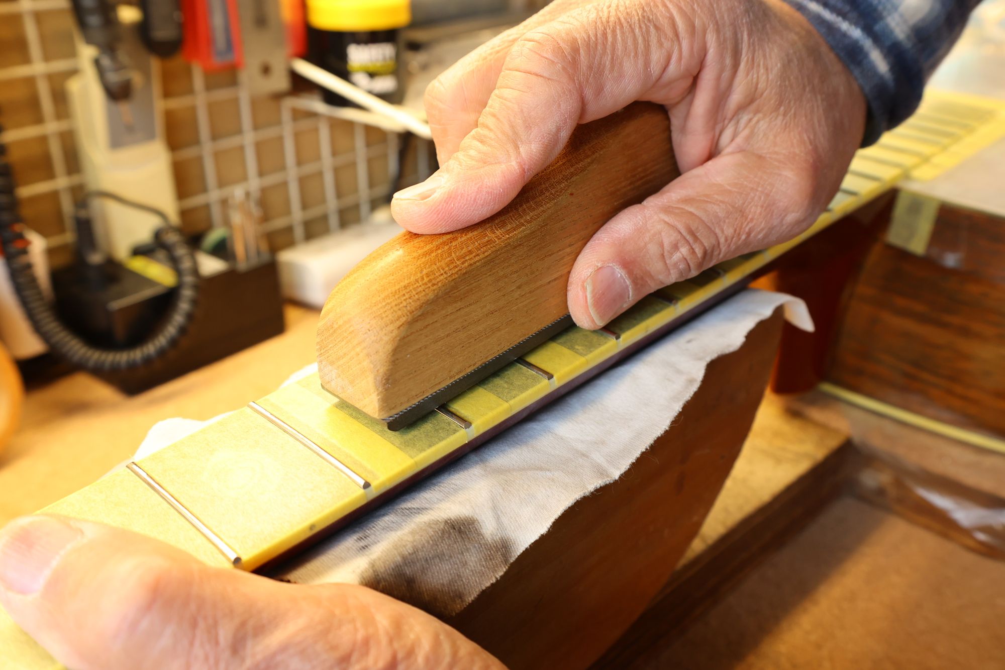 - 31.引き続いてフレットすりあわせを行いましょう。マスキングテープでフィンガーボードを保護します。