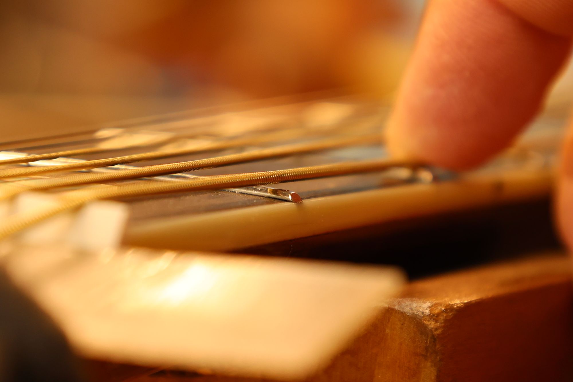 - 21.弦を張って弦高調整を行います。2フレットを指で押さえて1フレットと弦の隙間がギリギリに下がるまでナット高を下げます。