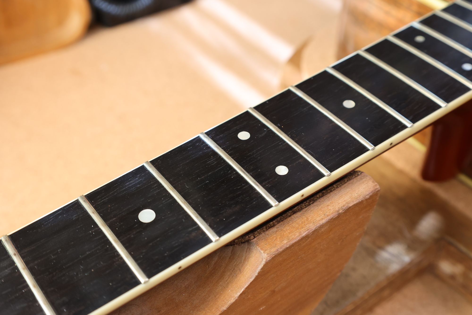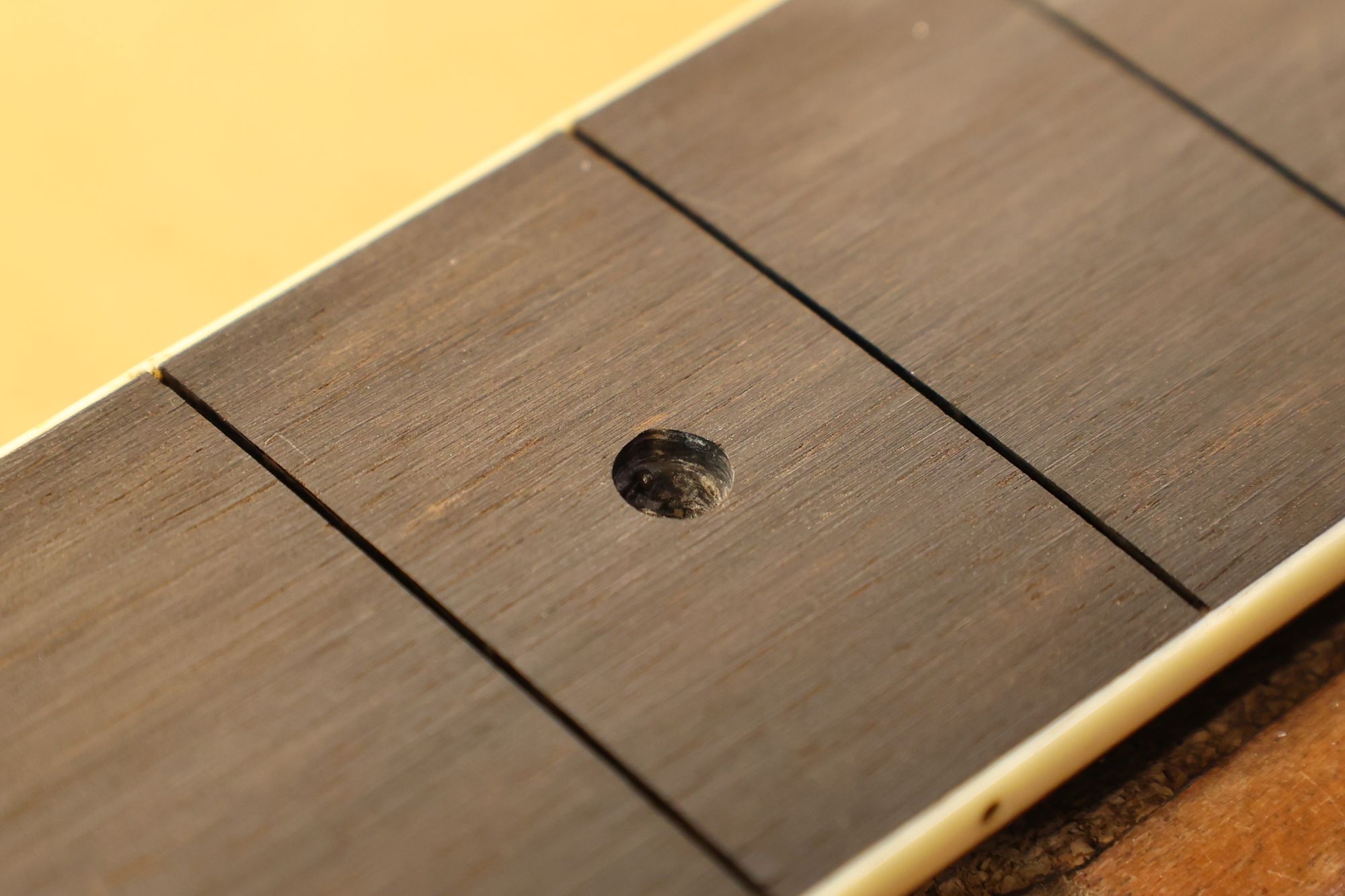 - 2.フレットを抜きました。丸形ポジションマークを六角形のものに入れ替えましょう。